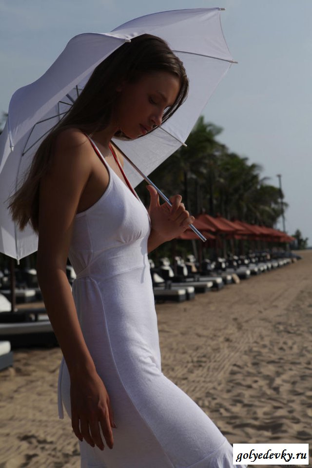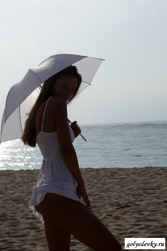 Как романтично гулять по песку скрываясь от палящего солнца под зонтиком и наслаждаться кристально чистым воздухом, идущего с океана. Красивая европейка в белом обтягивающем платье не просто так сюда забрела, она выбрала такой день, в котором людей будет по минимуму. Милашка в начале начнём загорать в своём купальнике, после чего избавится от него и перед нами предстанет настоящая идеальная красота, потрясающие голые сиськи и попа. А киска предел мечтаний любого, убедитесь сами.